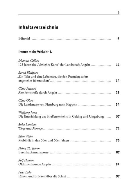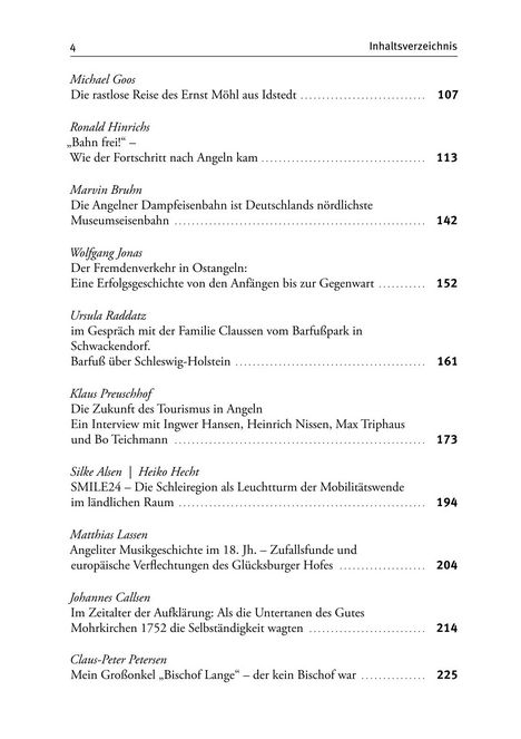 Der Bogen spannt sich von der Geschichte der Straßen in unserer Landschaft über die Museumseisenbahn und die Oldtimerfreunde, über die Anfänge des Fremdenverkehrs bis zur Zukunft des Projektes SMILE 24. Sogar eine frühe Reisebeschreibung durch Angeln von 1871 ist dabei. Ein weiterer Aufsatz befasst sich mit den Veränderungen, die den Beginn der Eisenbahn in Süderbrarup und Satrup ausgelöst haben.In einem langen Interview geht es um die Zukunft des Tourismus in unserer Landschaft.